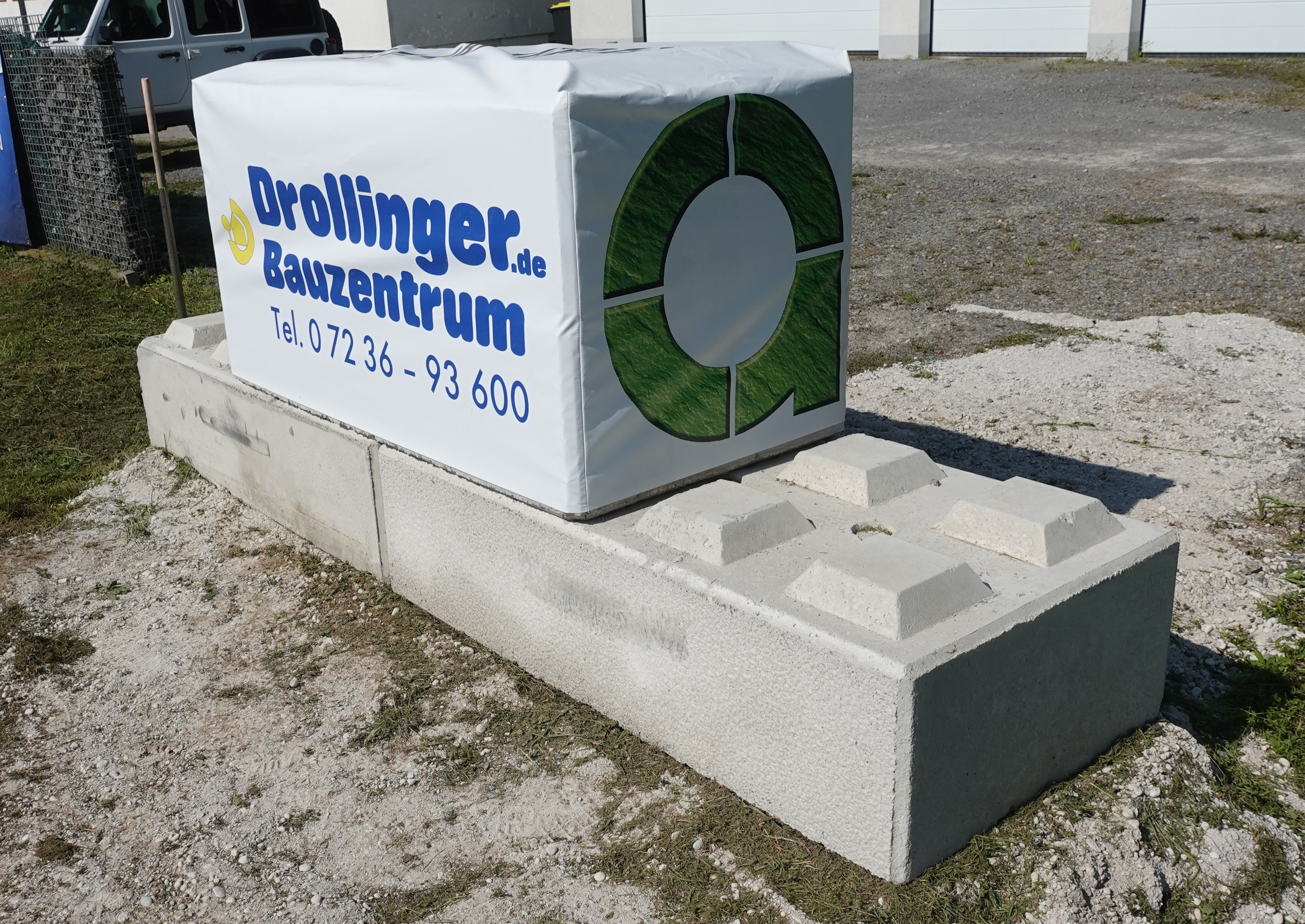 Für zusätzliche Sichtbarkeit können die Steine übereinander gestapelt werden. In Kombination mit individuell bedruckbaren Werbehauben lassen sich Sicherheitsmaßnahmen wirkungsvoll mit Werbebotschaften, Hinweisen oder Gemeindeinformationen verbinden.